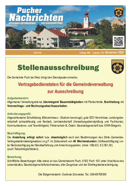 Werde Teil unseres Teams! Die Gemeinde Puch bei Weiz bringt die Stelle eines/er Vertragsbediensteten für die Gemeindeverwaltung für 40 Wochenstunden (auch Teilzeitmöglichkeit) mit ehestem Dienstantritt zur Ausschreibung (m.w.d.)! Stellenausschreibung