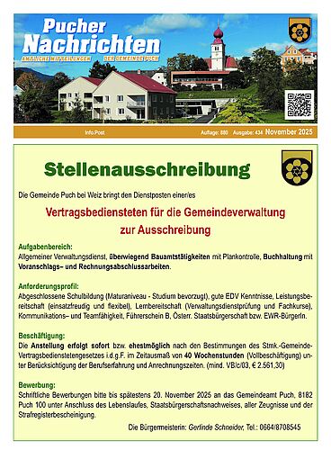 Werde Teil unseres Teams! Die Gemeinde Puch bei Weiz bringt die Stelle eines/er Vertragsbediensteten für die Gemeindeverwaltung für 40 Wochenstunden mit ehestem Dienstantritt zur Ausschreibung (m.w.d.)! Stellenausschreibung