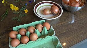 Dafür benötigen Sie reichlich äußere, dünne Schalen von braunen und roten Zwiebeln – circa 70 Gramm. (Beginnen Sie vielleicht die Schalen bereits einige Zeit vor Ostern zu sammeln). Damit die Eier zu richtigen kleinen Kunstwerken werden, können Sie außerdem verschiedene Blüten, Blätter und Gräser zur Verzierung verwenden.