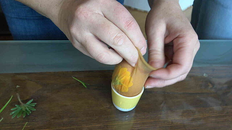Die gewünschten Blüten oder Gräser dienen als natürliche Stempel, welche auf die Schale übertragen werden. Dafür müssen Sie zunächst die jeweiligen Muster auf ein Ei legen, ein Stück Feinstrumpf darüber ziehen, auf der hinteren Seite zusammendrehen und mit Küchengarn festbinden. (Befeuchten Sie Blätter und Blüten leicht, so haften diese besser auf dem Ei).