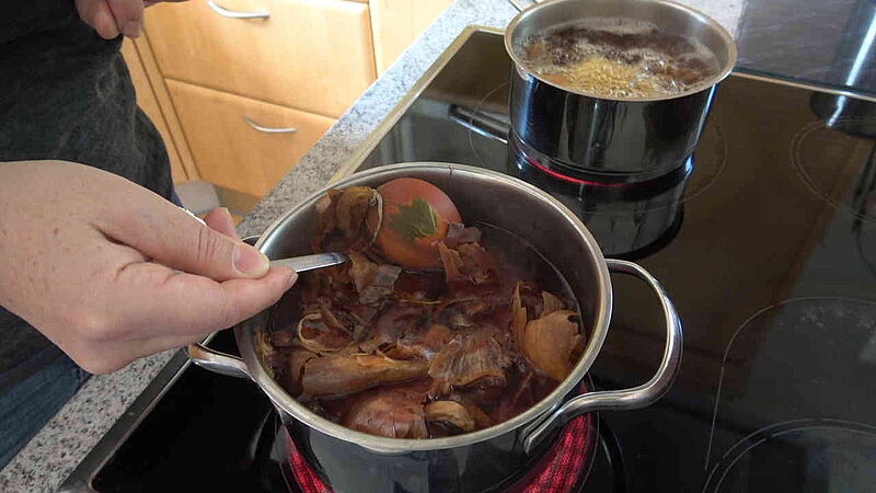 Nun circa 2,5 Liter Essigwasser mit den Zwiebelschalen aufkochen, bis ein schöner rotbrauner Sud entsteht. Legen Sie die Eier vorsichtig mit einem Esslöffel hinein und lassen Sie diese etwa zehn Minuten kochen. Anschließend noch eine halbe Stunde im Farbbad liegen lassen, denn je länger die Eier drinnen bleiben, desto intensiver der Farbton. Spülen Sie die Eier anschließend kalt ab und packen Sie diese aus.